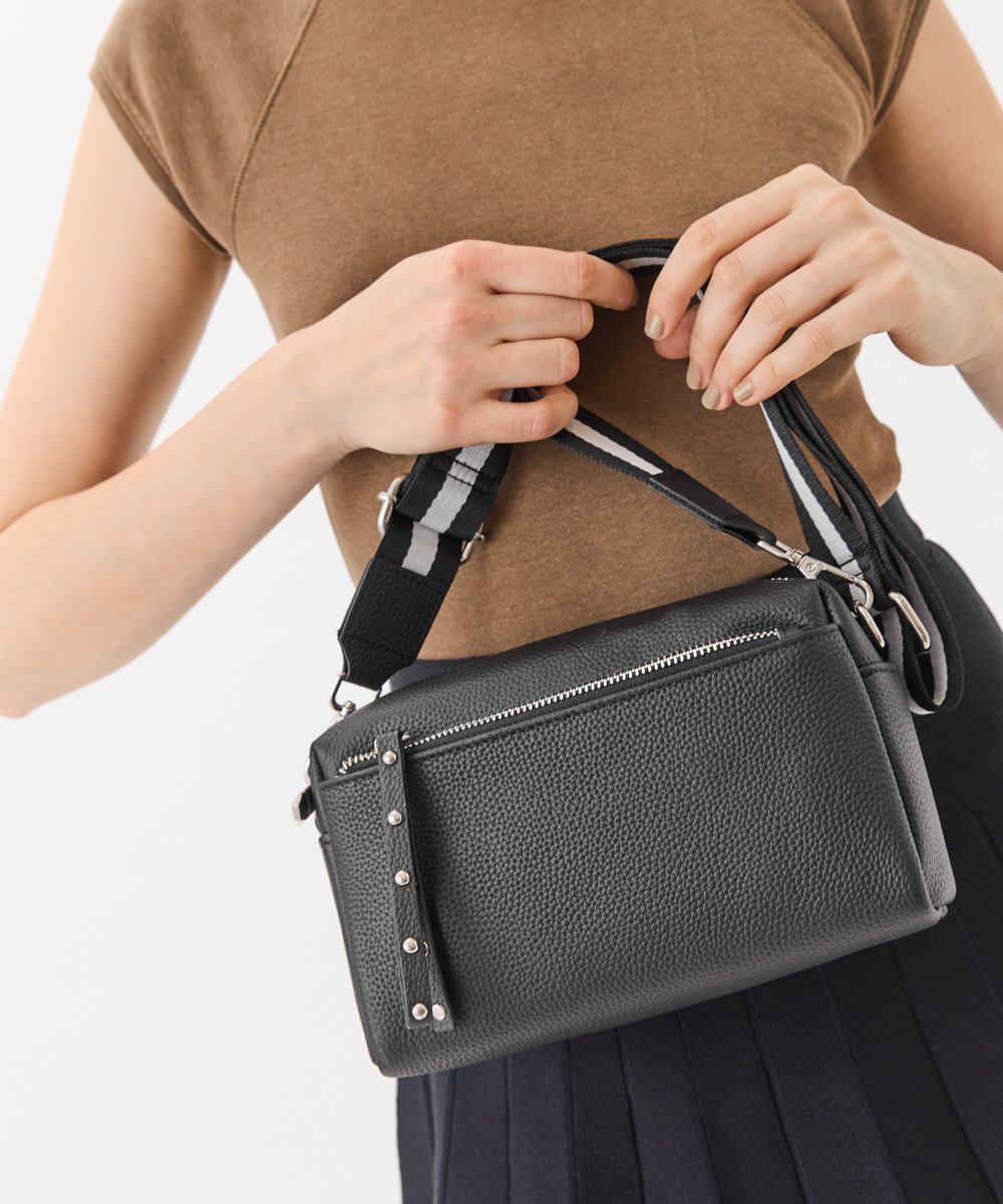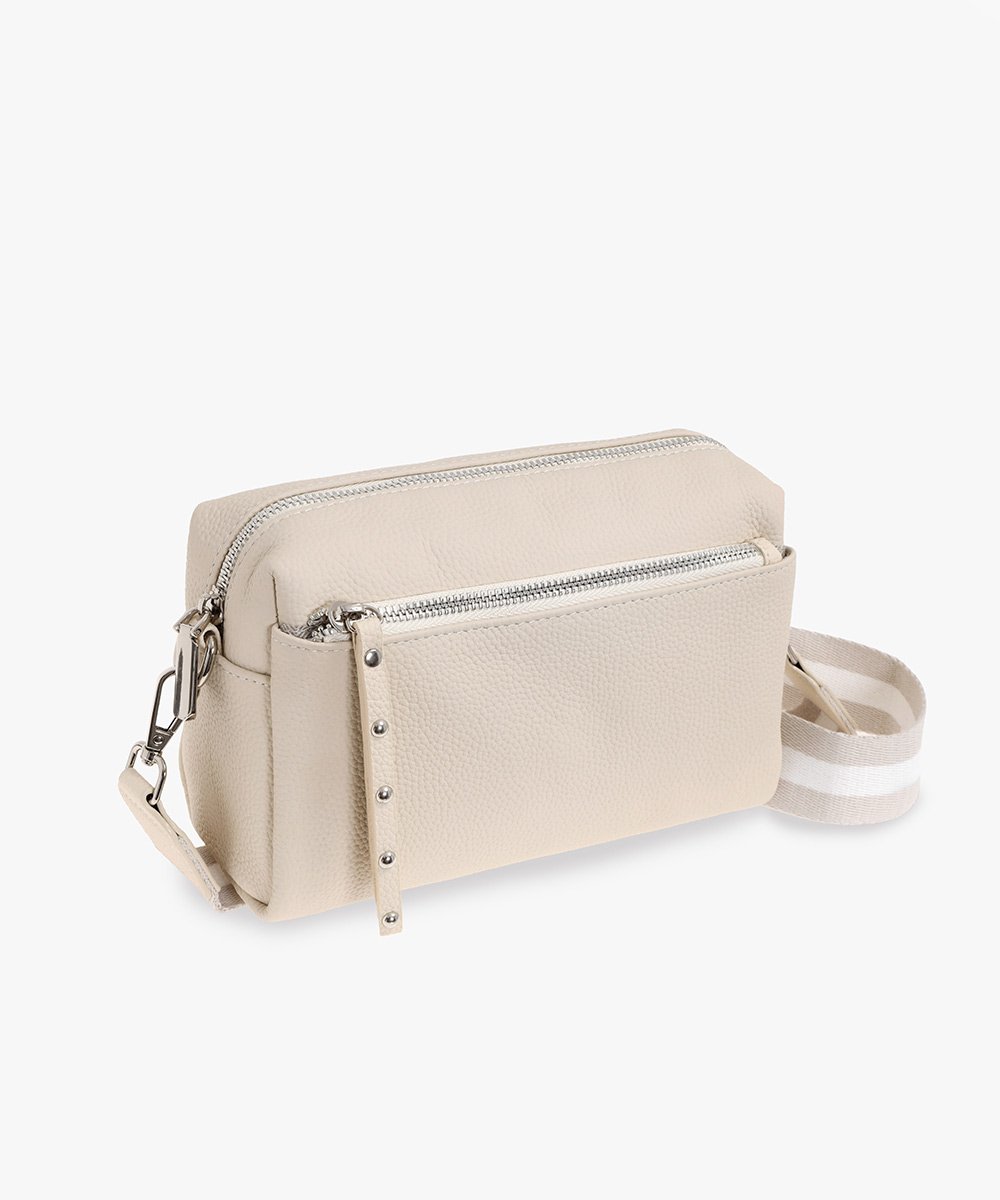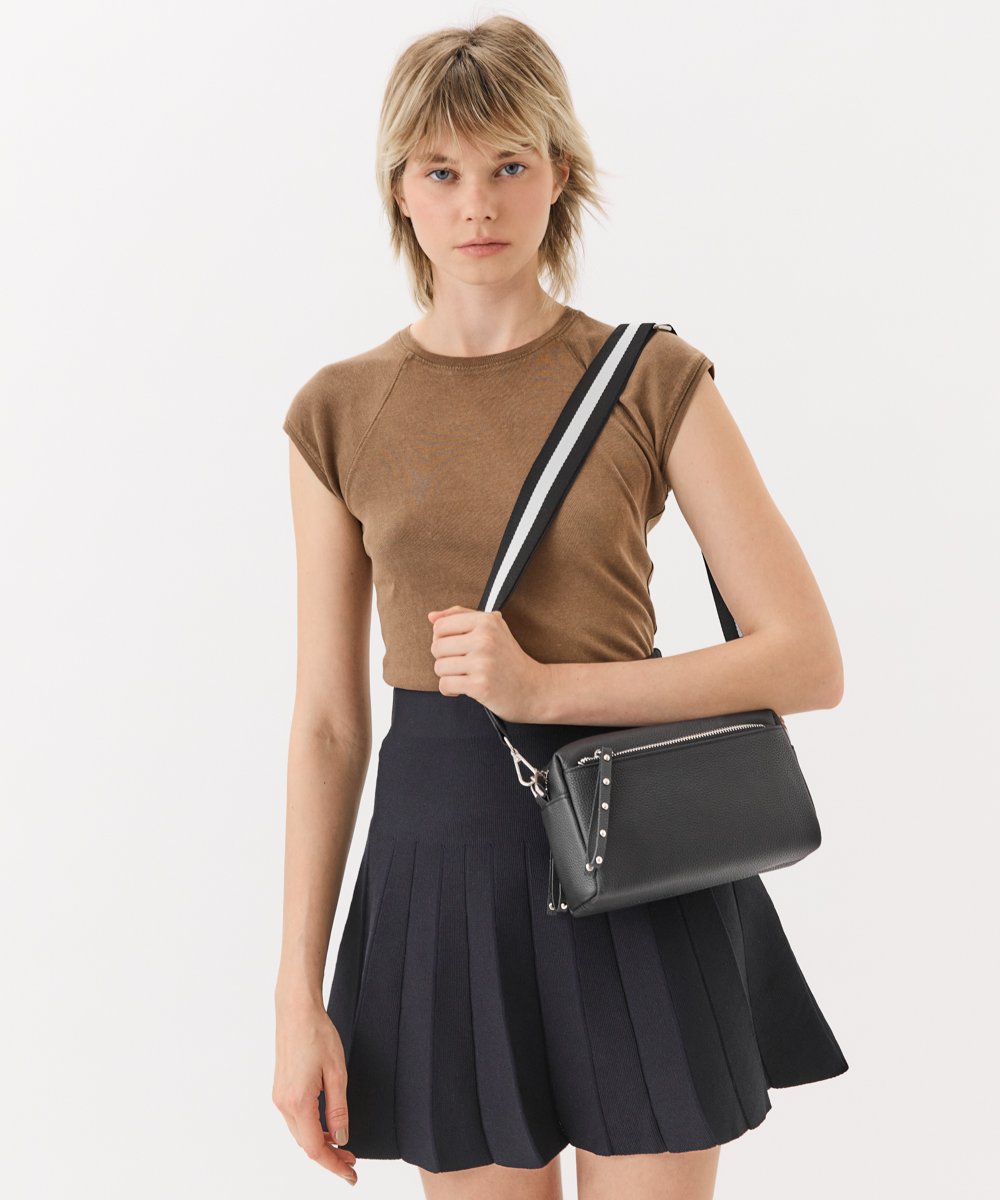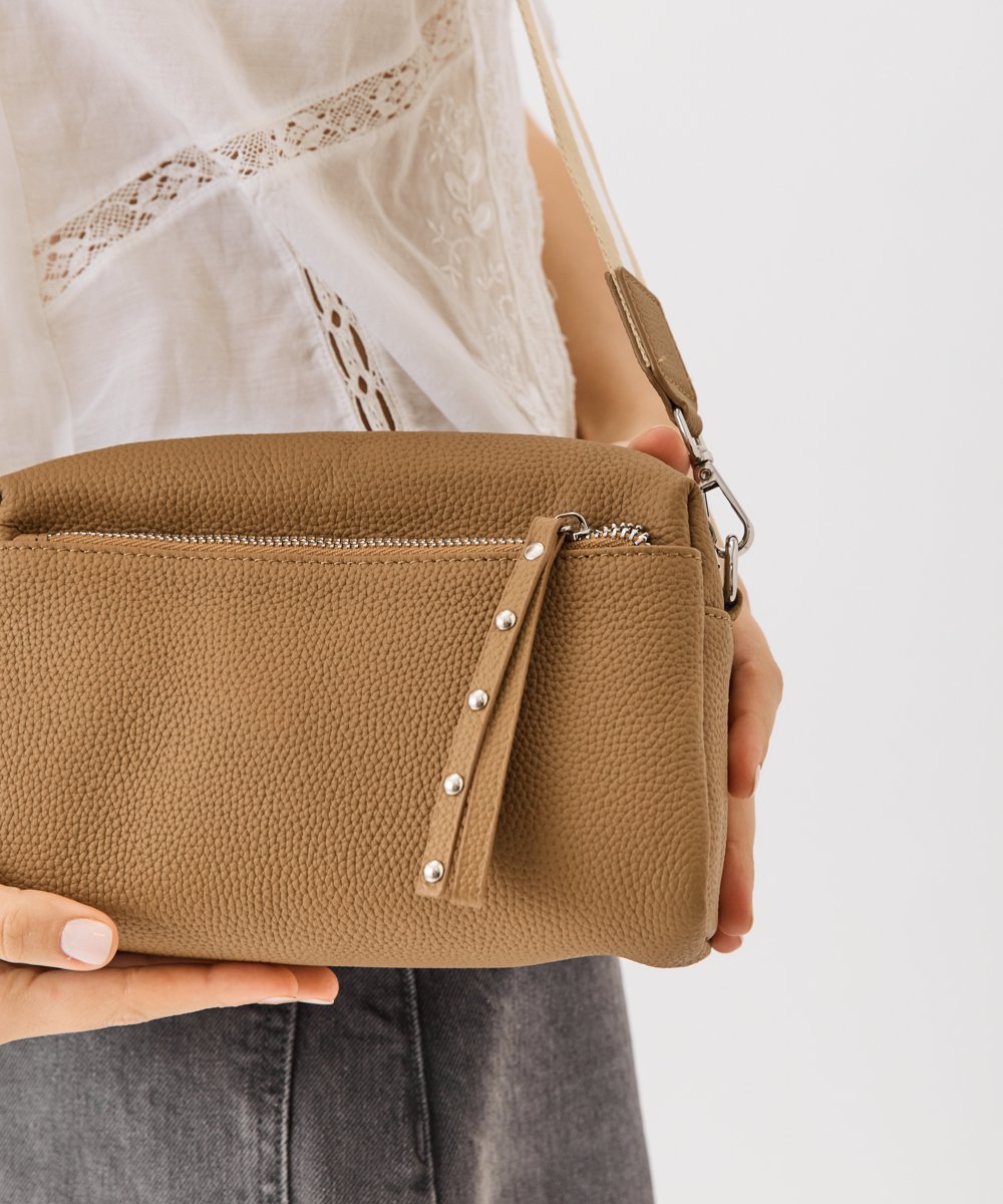 תיק צד קטן בצורת קופסה. עשוי עור. לתיק רוכסן עליון גדול שפותח לגוף התיק, ורוכסן נוסף קטן בחלק הקדמי. בחלק הקדמי של התיק ניטים קטנים בצבע כסף, המעניקים לו מראה אופנתי יחודי.