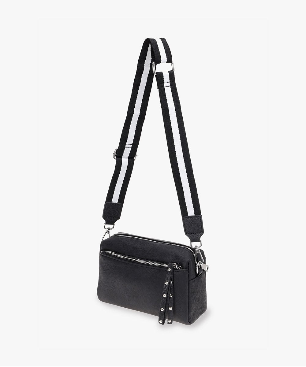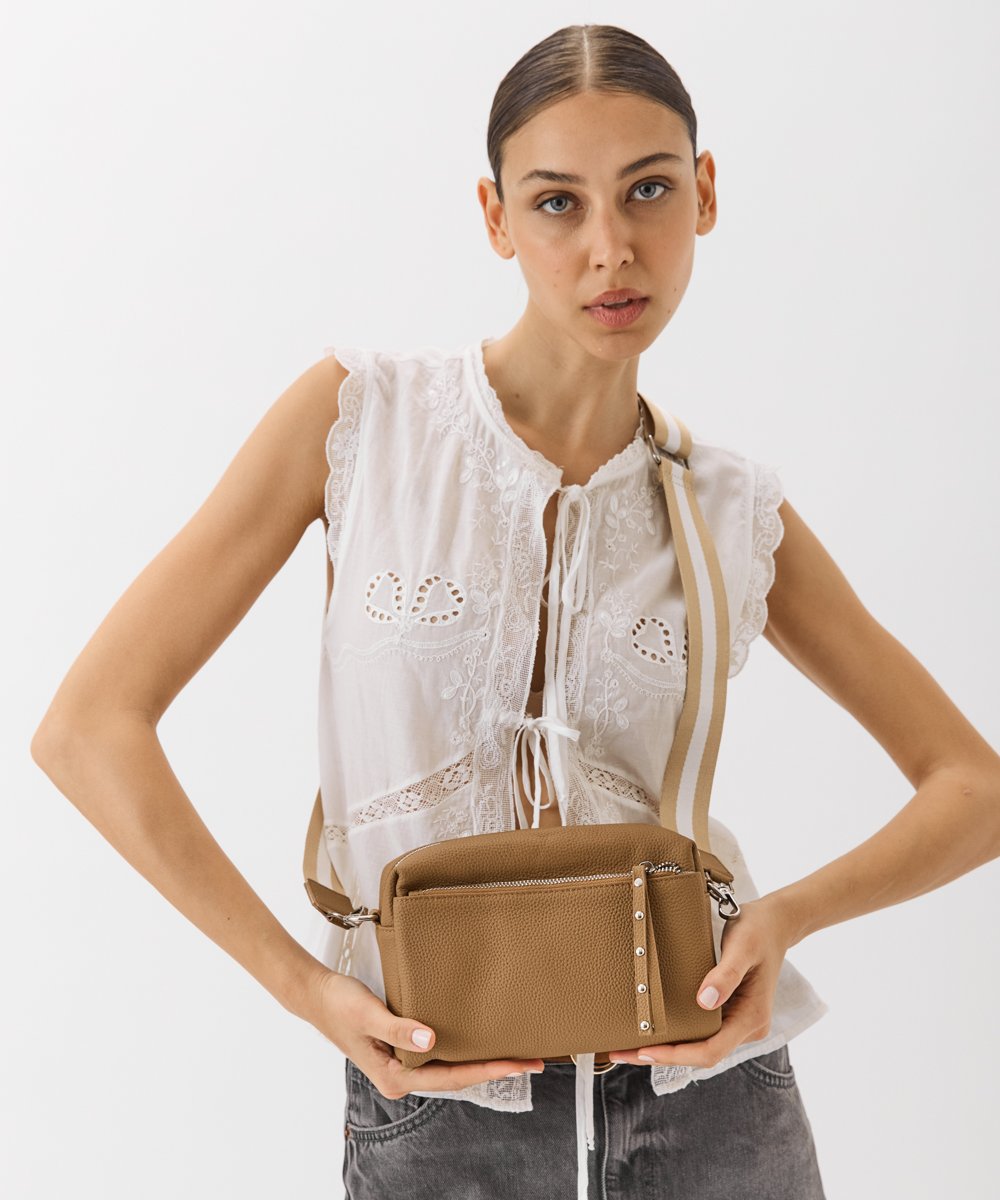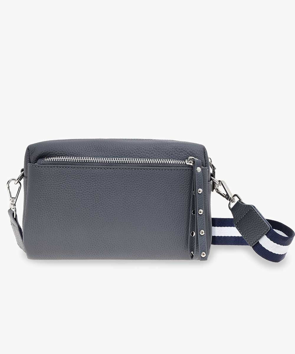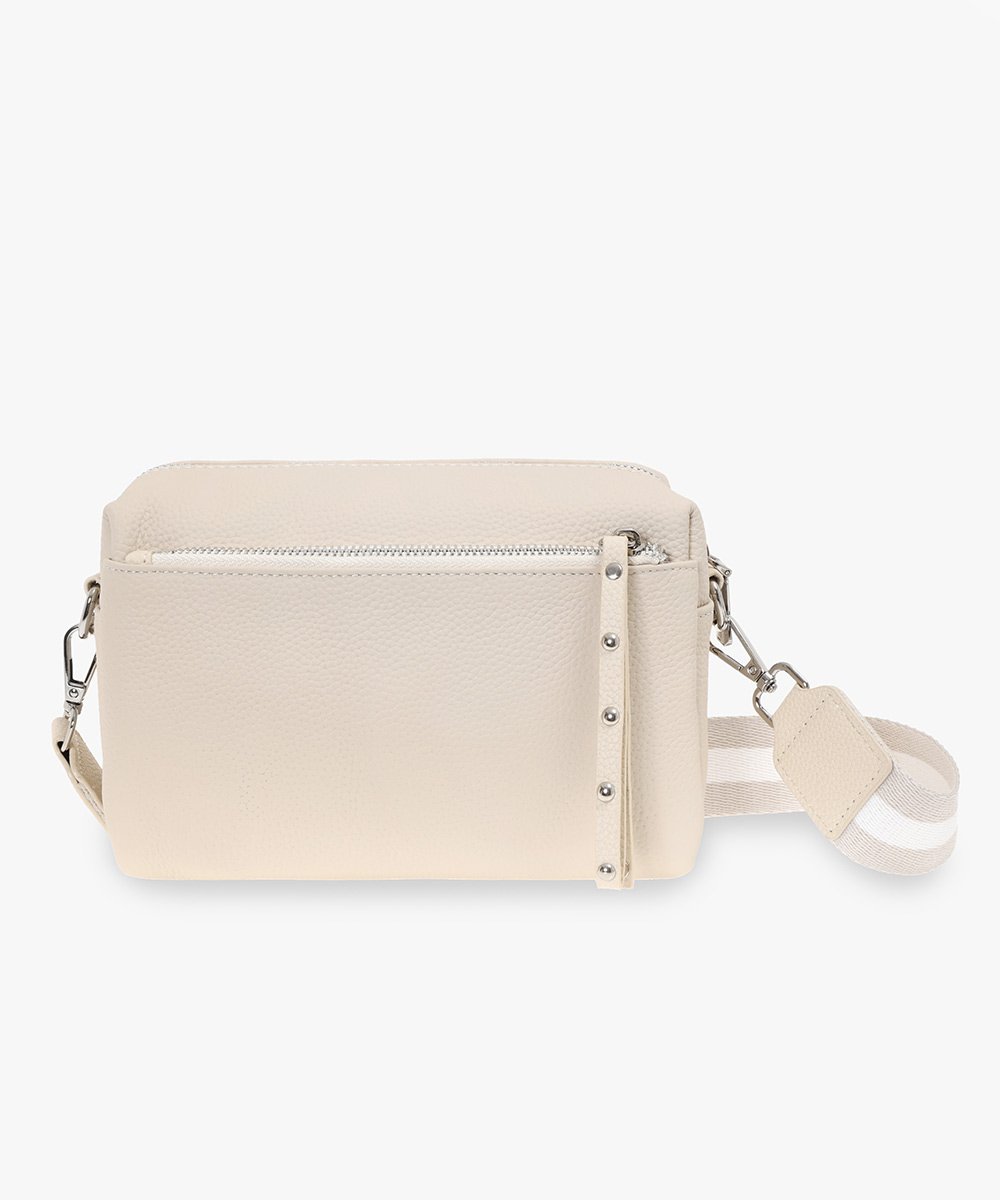 תיק צד קטן בצורת קופסה. עשוי עור. לתיק רוכסן עליון גדול שפותח לגוף התיק, ורוכסן נוסף קטן בחלק הקדמי. בחלק הקדמי של התיק ניטים קטנים בצבע כסף, המעניקים לו מראה אופנתי יחודי.