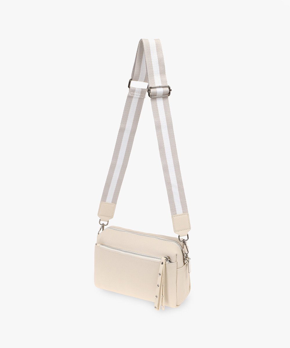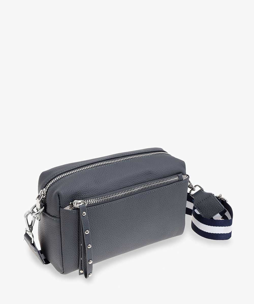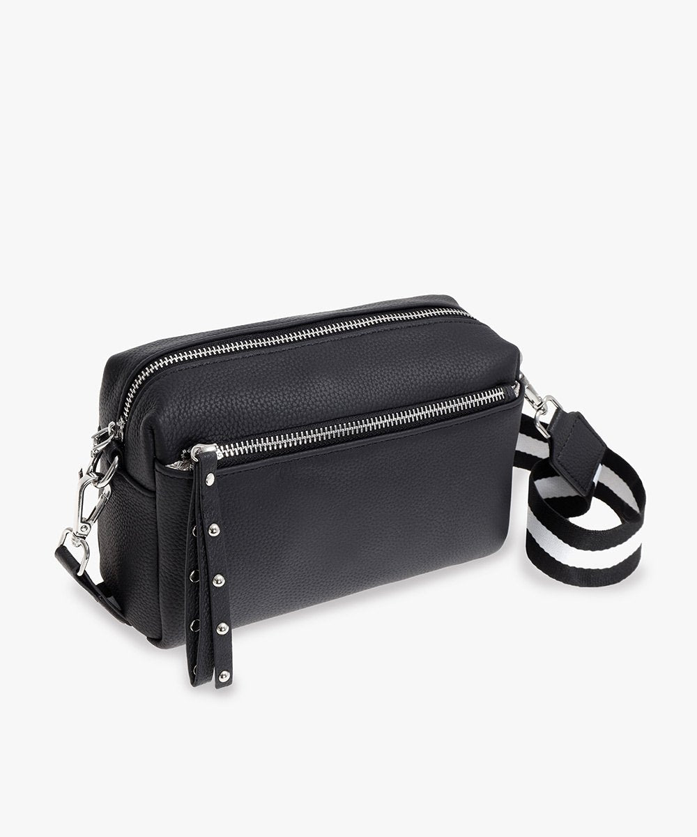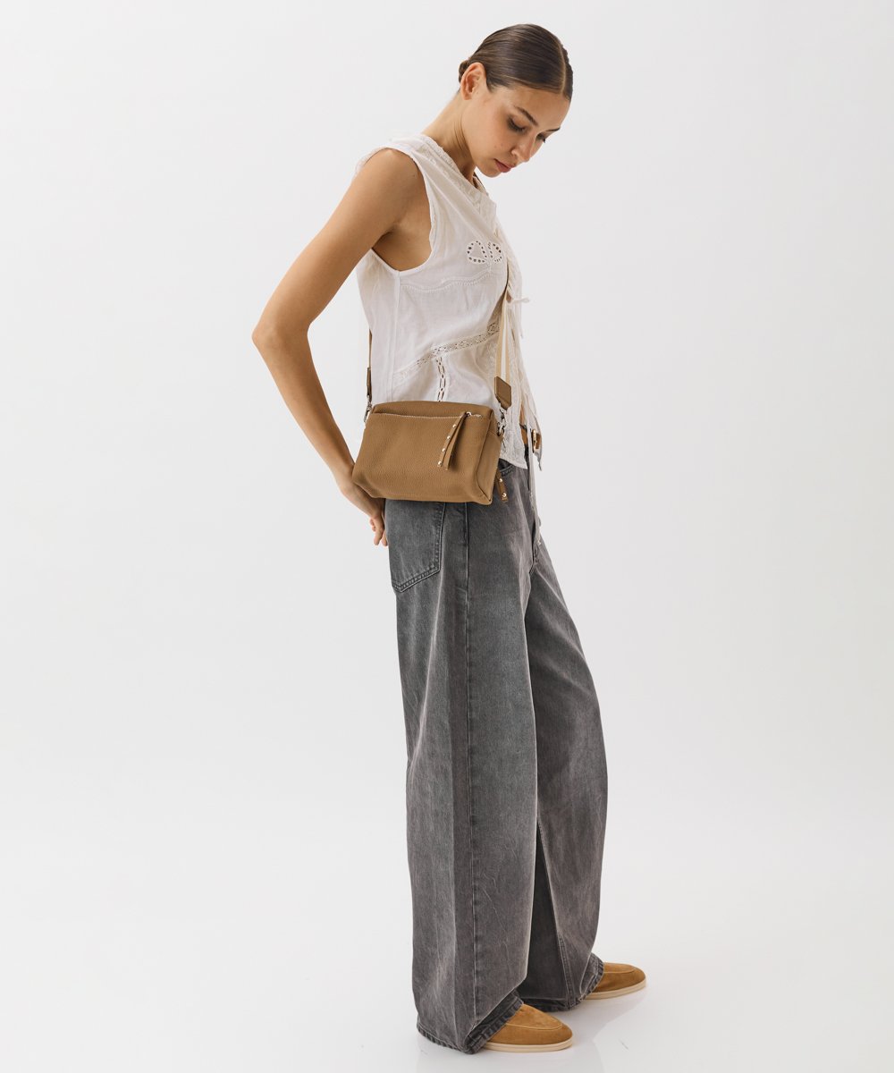 תיק צד קטן בצורת קופסה. עשוי עור. לתיק רוכסן עליון גדול שפותח לגוף התיק, ורוכסן נוסף קטן בחלק הקדמי. בחלק הקדמי של התיק ניטים קטנים בצבע כסף, המעניקים לו מראה אופנתי יחודי.