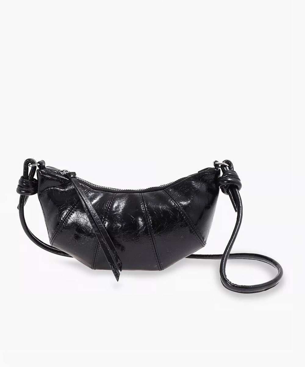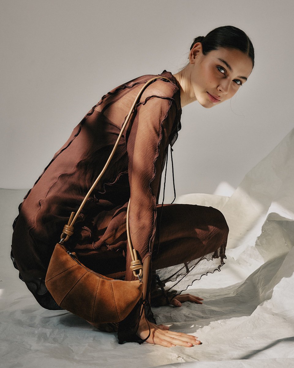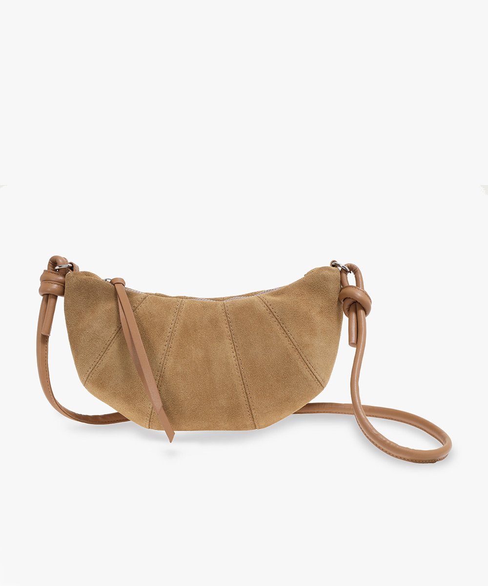 תיק מעור דגם נגה, התיק בעל צורה ייחודית וחצי עגולה, ונסגר ברוכסן. מכיל תא פנימי עם רוכסן וכיס פנימי קטן.