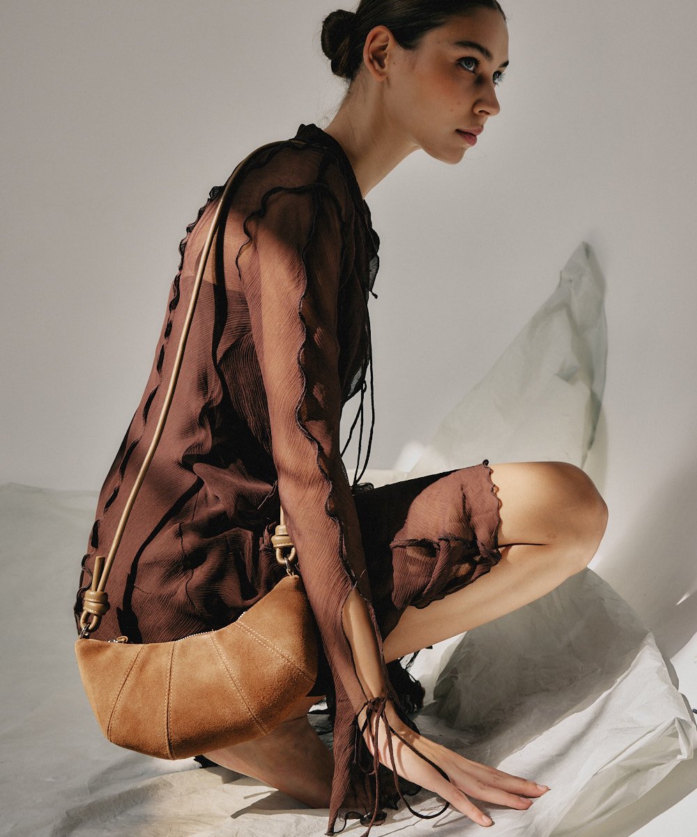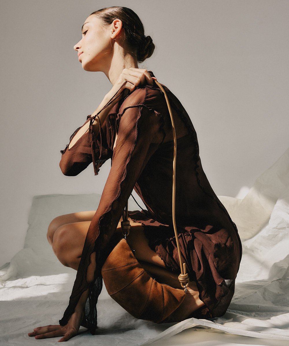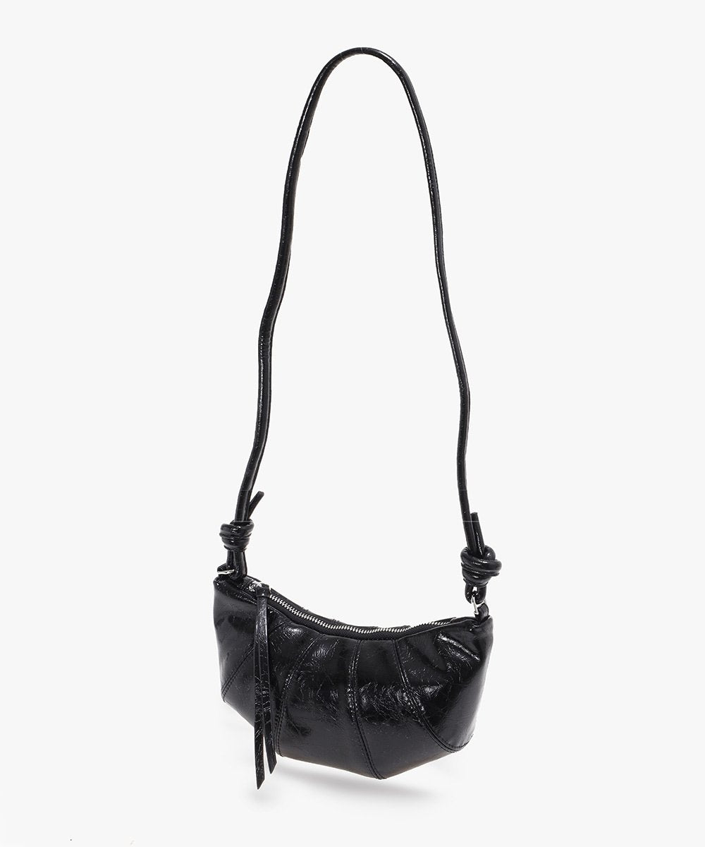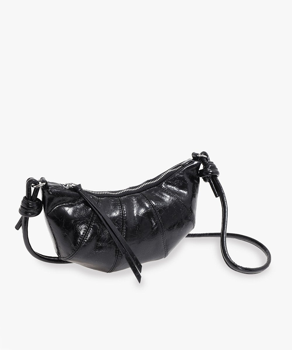 תיק מעור דגם נגה, התיק בעל צורה ייחודית וחצי עגולה, ונסגר ברוכסן. מכיל תא פנימי עם רוכסן וכיס פנימי קטן.